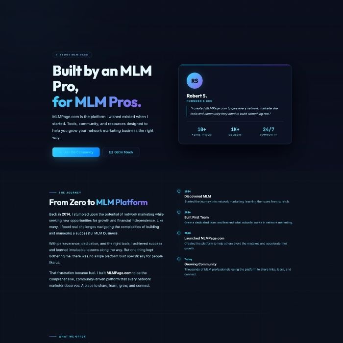 Proven tools, real guidance, and a community that actually helps. Your professional MLM website is one click away.